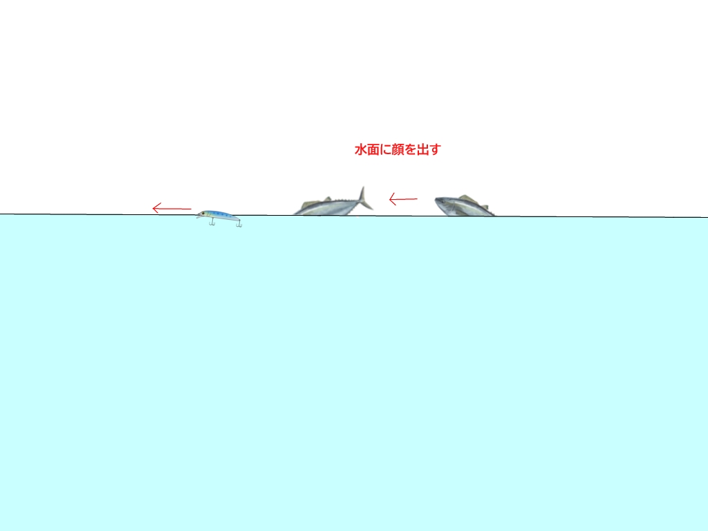 青物などがベイトを追って水面に出てくること。引いてるルアーを追ってきた魚が水面に顔を出すこと。